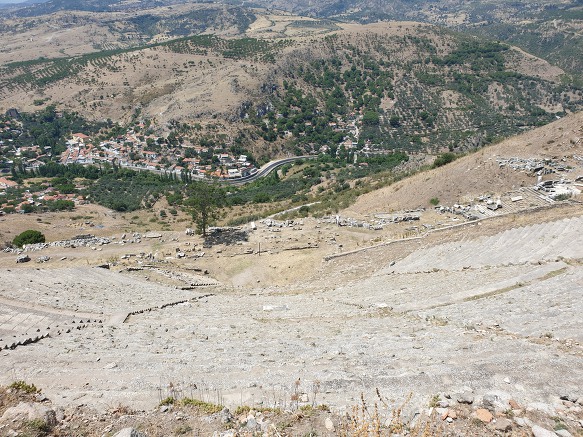 도서관 남쪽으로 더 가면 가파른 야외극장이 나온다. 이 극장은 BC 3세기 유메네스 2세 때 세워졌다가 로마시대에 개조되었다고 알려져 있다. 그런데 발굴조사를 통해 BC 3세기 휠씬 전에 극장이 있었다는 사실이 확인되었다. 즉 고대부터 내려오는 극장을 계속 보수 확장한 것이다. 아크로폴리스의 이 야외 극장은 역사상 가장 가파른 경사로에 만들었으며 무려 1만명을 수용할 수 있다. 에페우스의 야외극장과 더블어 소아시아아에 남아 있는 가장 큰 규모의 극장이다. 로얄박스와 대리석 연단, 극장 테라스도 확인되며 지금으로 부터 무려 2000년 전에 1만명이 모여서 어떤 공연을 감상했을까 궁금해지는 것은 나만은 아닐듯 하다^^