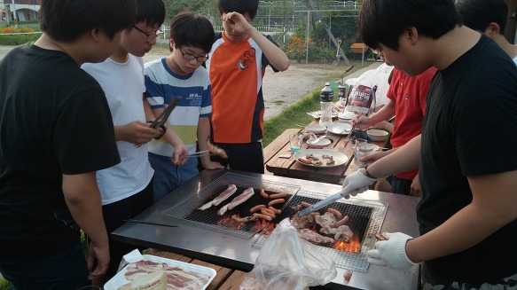 우리반 최고 대식가인 형호네 조는 삼겹살이 아니라 목살을 준비했다. 집게를 잡은 녀석이 조장인 형호. 기름이 적어 덜 타고 굽기가 쉽다. 숯불구이에 적적한 선택이라고 할 수 있다. 삽겹살을 구울 때도 한가지만 준비하면 덜 태우고 맛있게 구울 수 있다. 일명 칙칙이라는 물뿌리개를 준비하는 것이다. 기름이 떨어져 불이날 때마다 물을 뿌려 꺼주면 된다. 숯불이 꺼질까봐 걱정하는 분이 있는 데 꺼지지 않으니 걱정 붙들어 매시라^^ 물을 뿌려 불을 조절해 주는 이 방식은 독일넘들에게 배운 것이다. 나 혼자 개발한 야매(?) 가 아니니 반드시 실천해 보시기를 바란다.
